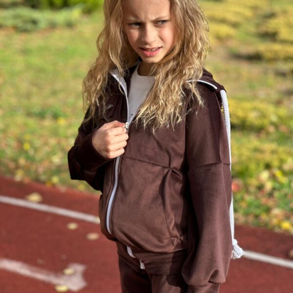 DRES WELUROWY OPCJA Z DZWONAMI LUB GETRAMI Velvet w kolorze brązowym to szlachetna tkanina przypominająca aksamit. Wraz z nią należy